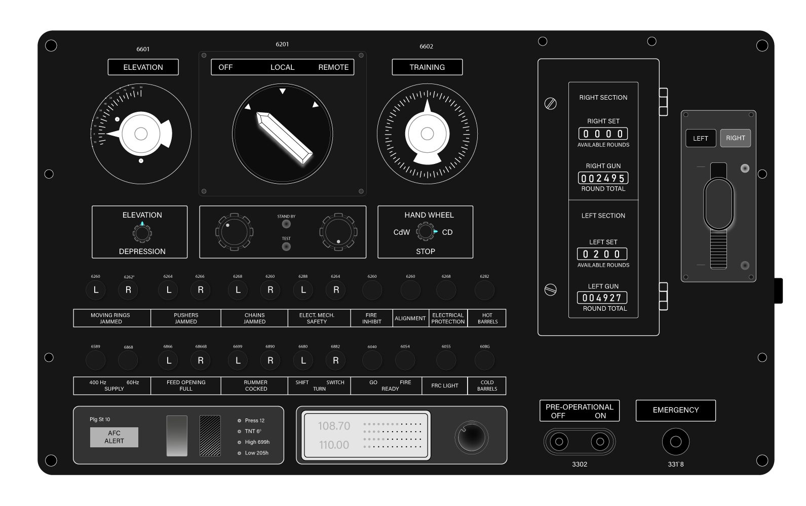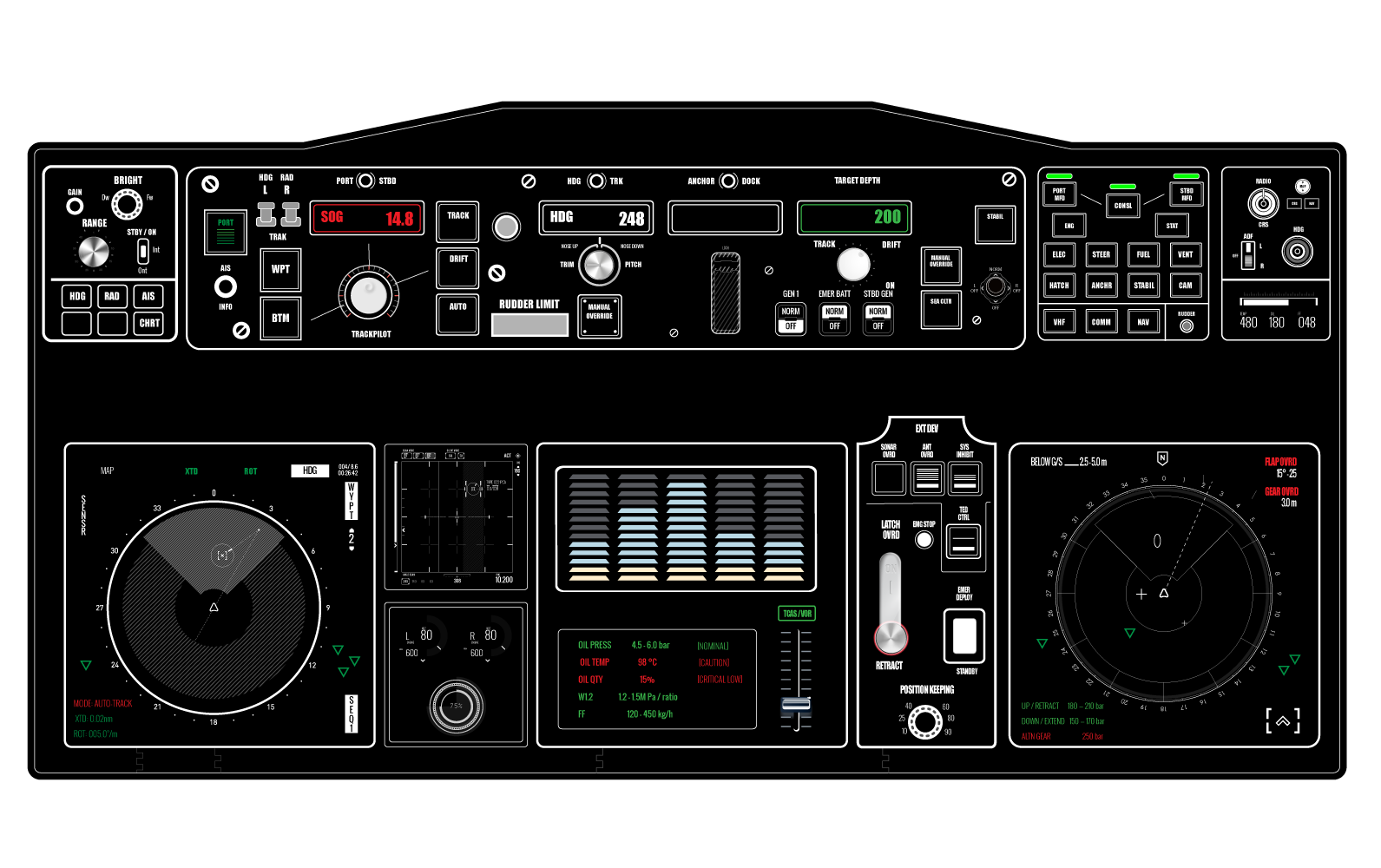 This console is a hybrid workstation where the digital interface is integrated with physical controls. The design is focused on situational awareness and maximum responsiveness in extreme conditions.